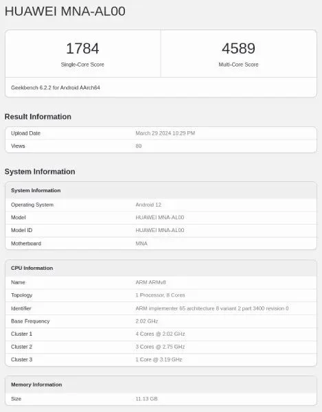 Det är oklart vad det kan komma att kallas, men vi ser imponerande siffror på bilden här nedan. Multi Score imponerar men det är främst Single Core som imponerar mest om ni frågar oss. Samtidigt ser vi att modellen har 12 GB RAM och att den kommer få en OS-version av Harmony som baseras på urgamla Android 12 – blä!